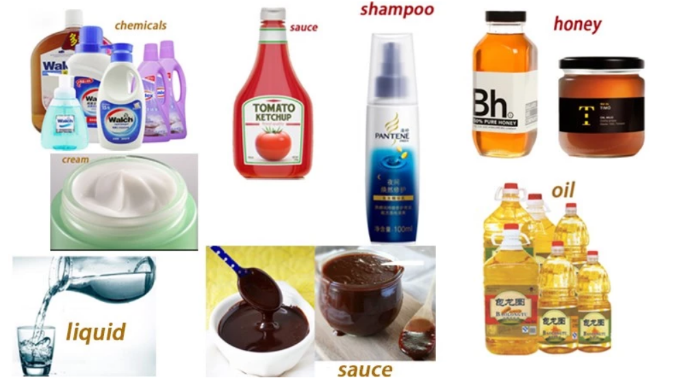 আধা-সান্দ্র এবং সান্দ্র তরল; বিড়ালছানা, সরিষা, সিরাপস, সালসা, মায়োনিজ, মধু, চিনাবাদাম মাখন, জেলি, ডুব দেওয়া সস, ঠোঁটের বালাম, শ্যাম্পু, ঘন সাবান, স্টাইলিং জেলস, ফেসিয়াল মাস্কস, মোম, আঠালো, গ্রীস, সিলেন্ট, সিলিকন এবং আরও অনেক কিছু