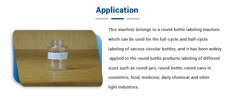 এই মেশিনটি একটি বৃত্তাকার বোতল লেবেলিং মেশিনের অন্তর্গত যা বিভিন্ন বৃত্তাকার বোতলগুলির পূর্ণ-চক্র এবং অর্ধ-চক্র লেবেলিংয়ের জন্য ব্যবহার করা যেতে পারে এবং এটি বিভিন্ন আকারের যেমন রাউন্ড জারস, রাউন্ড বোতল হিসাবে গোলাকার বোতলজাত পণ্যগুলির লেবেলিংয়ের ক্ষেত্রে ব্যাপকভাবে প্রয়োগ করা হয়েছে it , প্রসাধনী, খাদ্য, ওষুধ, প্রতিদিনের রাসায়নিক এবং অন্যান্য হালকা শিল্পগুলিতে গোল ক্যান qu আনুষাঙ্গিক রচনা: বৈদ্যুতিক মন্ত্রিসভা, পৌঁছানোর ব্যবস্থা, পৃথক বোতল ডিভাইস, রোলিং লেবেল ডিভাইস, ব্রাশ লেবেল ডিভাইস, 1 # লেবেল ইঞ্জিন, অপারেশন সিস্টেম এবং নিয়ন্ত্রণ সিস্টেম।